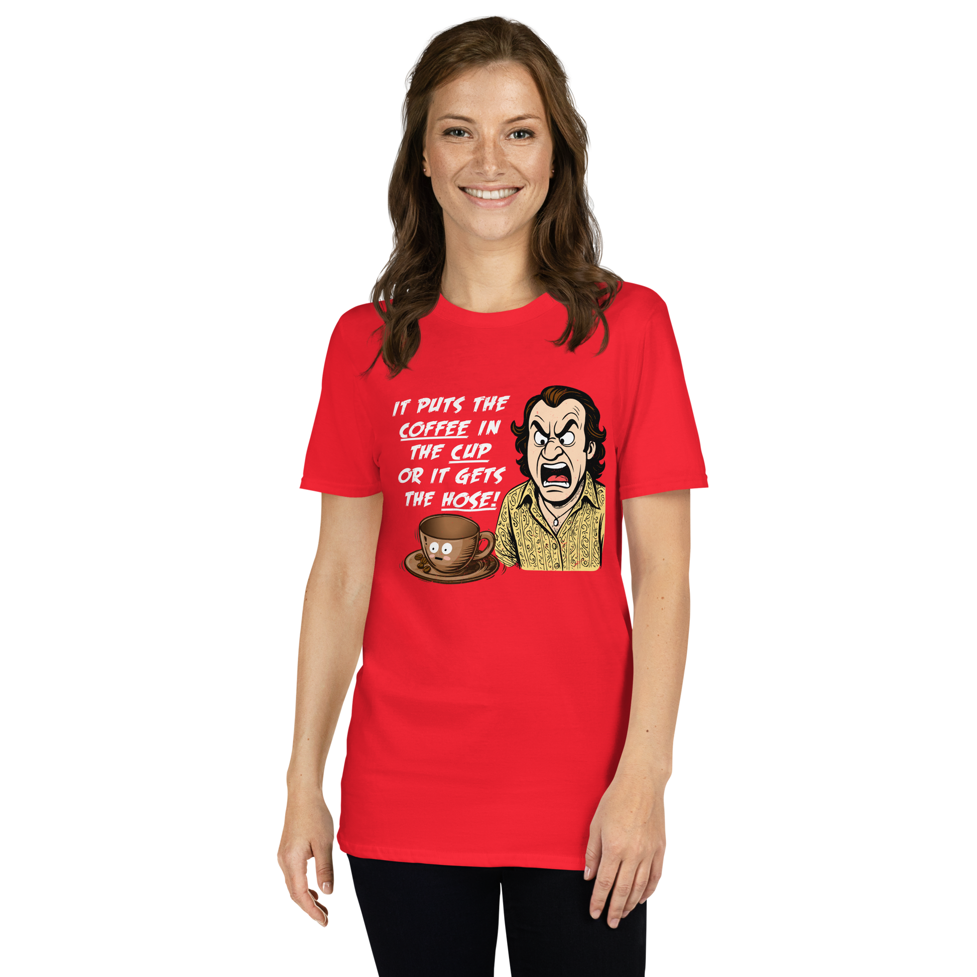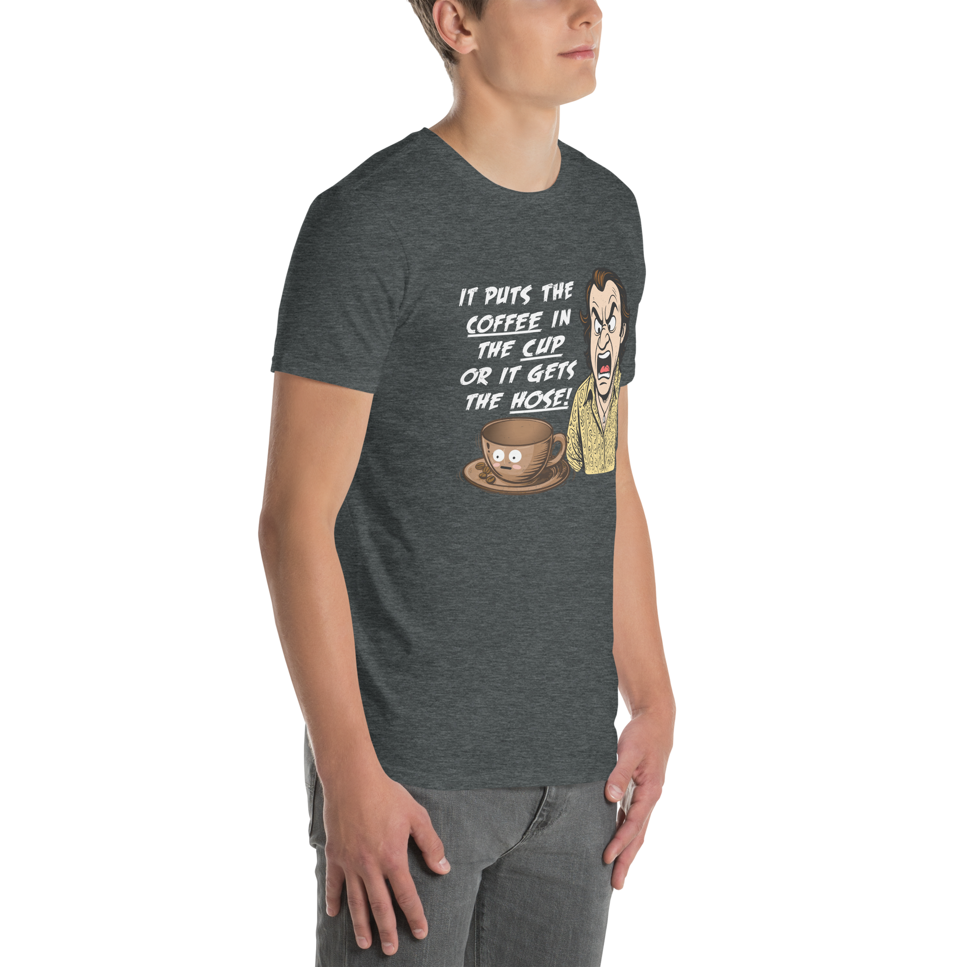 "IT PUTS THE COFFEE IN THE CUP OR IT GETS THE HOSE" - Funny Unisex Coffee Lover T-Shirt, Sarcastic Caffeine Addict Tee