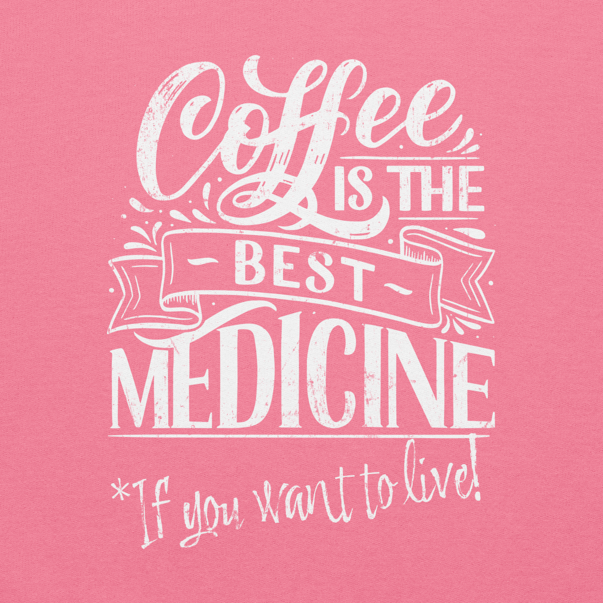 Simple, sharp, and quietly funny — the white-print version of “Coffee Is the Best Medicine If You Want to Live!” is a clean statement piece that says exactly what it means.