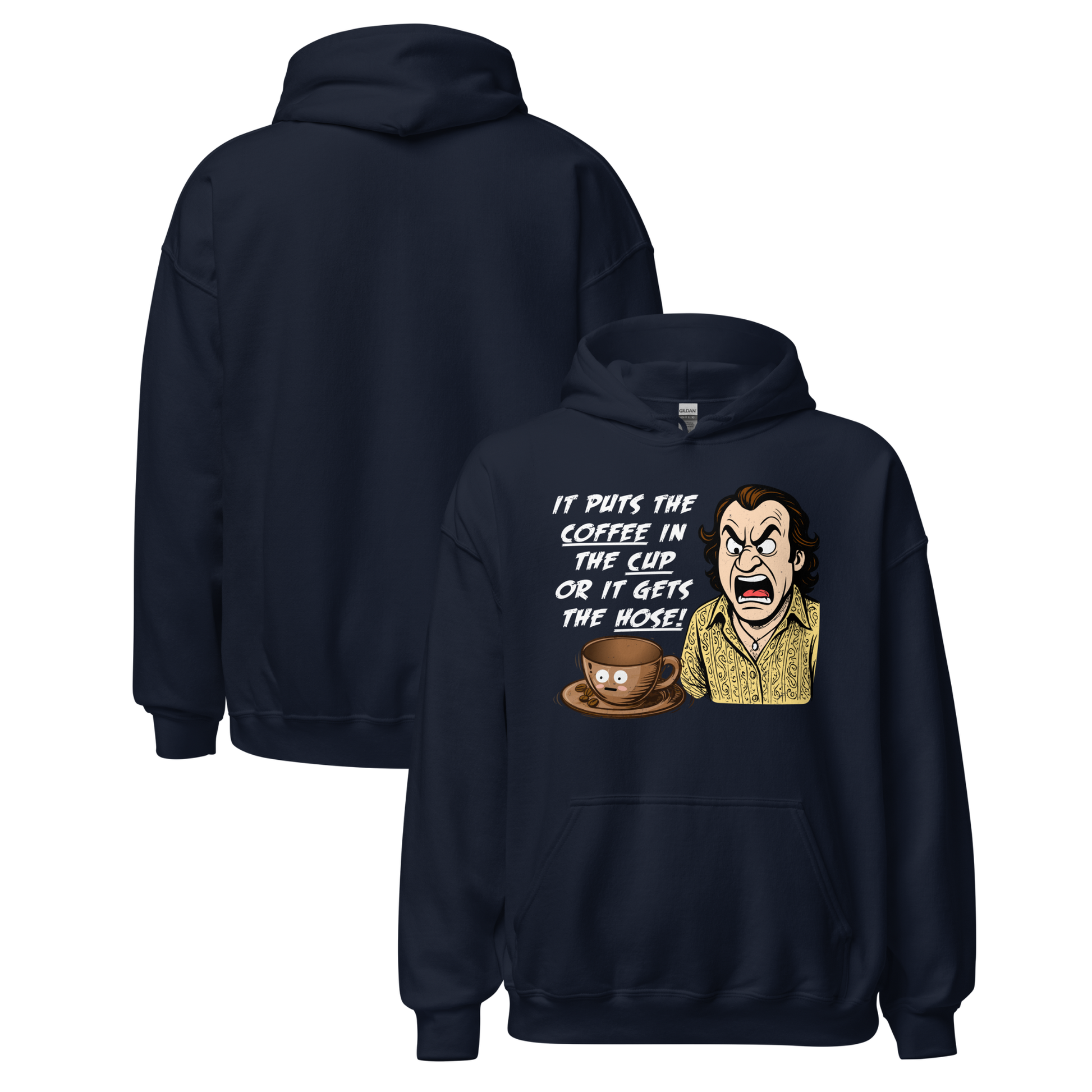 This unisex hoodie is for the caffeine die-hard who takes their brew, and their humor, seriously. Featuring the bold phrase “IT PUTS THE COFFEE IN THE CUP OR IT GETS THE HOSE” this design hits the sweet spot between chaos and comfort.